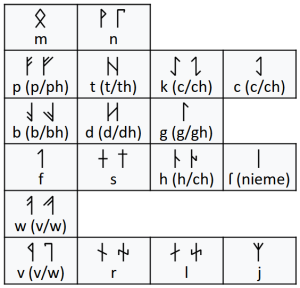 - Głoski /i/ i /j/ są alofonami. Głoska /j/ występuje zawsze na początku słowa (np. jûrwen), a głoska /i/ po spółgłoskach i przed samogłoskami (np. sántior) lub zwyczajnie jako samogłoska (np. néri, âlnir).